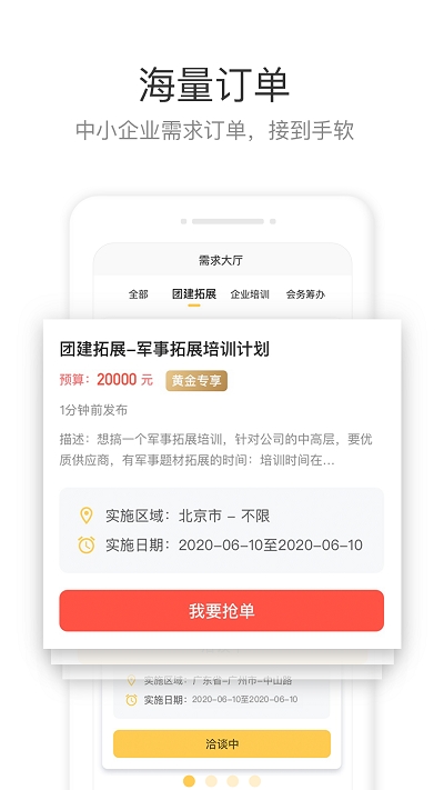 定位地理位置推送附近企业项目,其他城市的优质企业项目也可以查看,还能参加抢单;