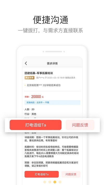 在查看需求信息的时候,有问题可直接反馈,也可以通过打电话的方式线下沟通交流;