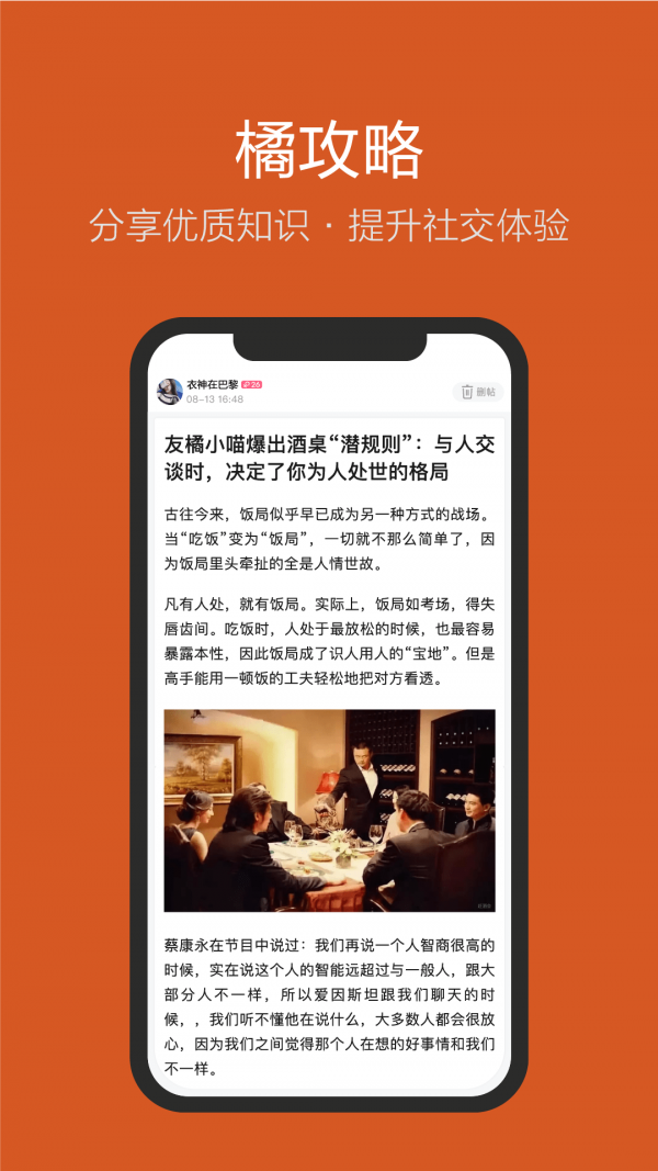 橘攻略:汇聚专业局主、达人,每日分享海量知识,让你在交友聚会的同时,不断增长社交经验,提升情商,更好的了解和融入环境、融入社会。