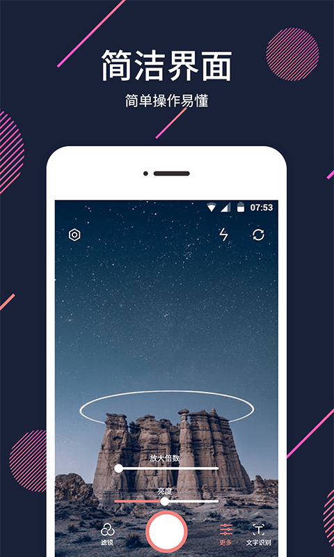 扩大镜这是款可以让你手机拥有放大镜功能的工具,可以想要查询的时候随时去使用,很适合那些老人使用,给老人手机安装一个,随时遇到小字要查看,便可以快速去查使用,安装包小巧而且非常实用,在看报纸、杂志等字体太小,无法清楚看到的时候,这款工具可以自动对焦。