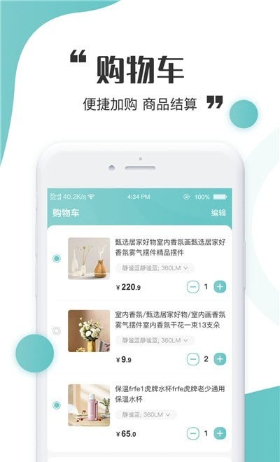 1、购物车,便捷加购,商品结算,一键就可以去购买;