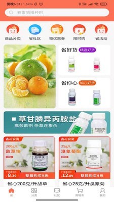 1.首页:省心农资软件底部主菜单,秒杀、抢购等促销活动,热卖、新品推荐。