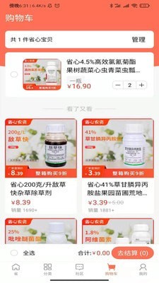 3.购物车:省心农资app任何途径进入商品(SKU)显示时,都可选入购物车;购物车可编辑。