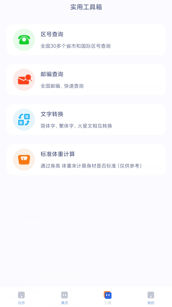 1、日历,有黄历宜忌、节日节气、吉日查询、历史查询;