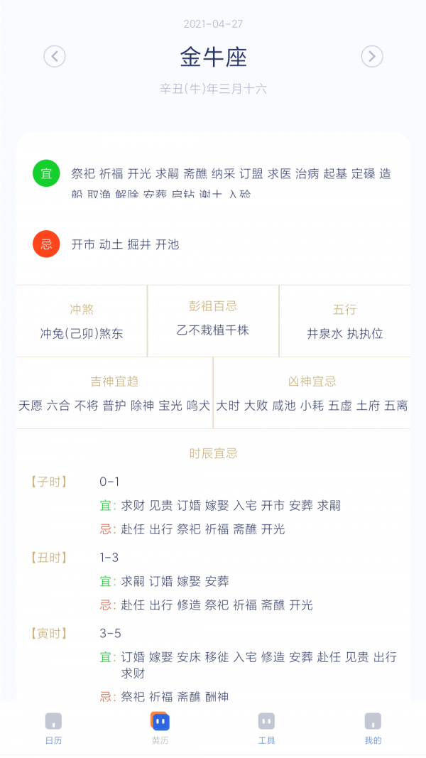 1、设置有很多的实用工具,包括吉日查询、日期计算、星座运势、生肖配对等;