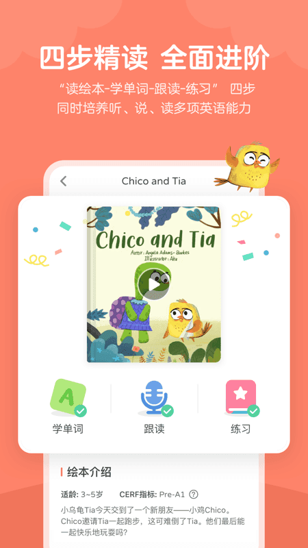 “读绘本-学单词-跟读-练习” 四步精读绘本,同时培养听、说、读多项英语能力。