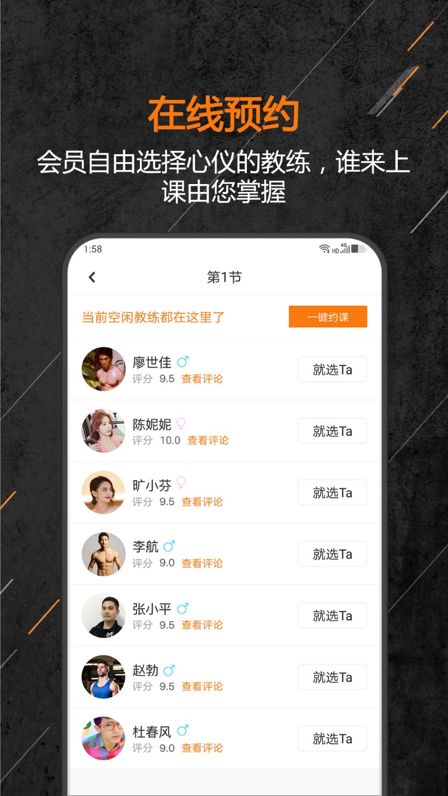 5.在线查看教练日程、一键预约教练,同教练、会员在线交流、健身群社交互动