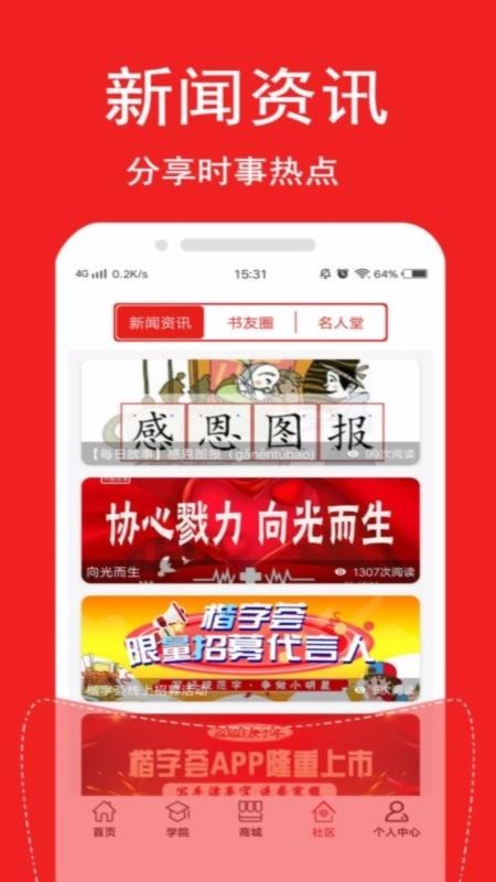 软件还提供了在线的教学,在书法上有什么不懂的,可以在线咨询老师,老师会为你解答,还有各式各样的活动,平台还为用户提供了关于书法的咨询新闻,让你真正的融入这个圈子,在书法上少走弯路更快的获得成效,感兴趣的小伙伴快去下载体验吧!