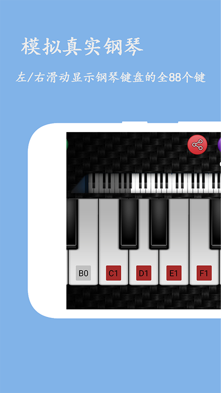 1.最真正的模拟钢琴左/右拖动显示信息钢琴键盘的全88个键;
