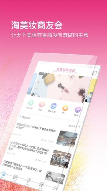 淘美妆商友会是一款美妆行业的线上服务平台,在淘美妆商友会用户可以直接对感兴趣的卖方和品牌方直接进行信息交流,可以参加品牌方的活动,可以了解美妆行业的新闻资讯,学习美妆知识。~淘美妆商友会app是一款新闻资讯服务手机软件,对于美妆护肤零售商要求消息推送行业最新动态,让零售商可以掌握行业变化收获创业商机;手机软件推送美妆护肤行业今日热点,客户只要每天花费少许时间用以阅读新闻资讯就能掌握到行业内发生的大事件,比如新法律规定颁布、新知名品牌发售等,轻松把握一手新闻资讯。