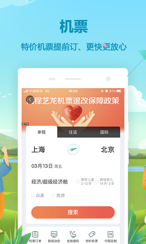 机票:提供接送机服务!再用不用排队等待!国内所有航线打折机票预订,快捷预订往返机票,航班动态实时查询,手机专享优惠,支持在线退款申请,并且实现微信支付;