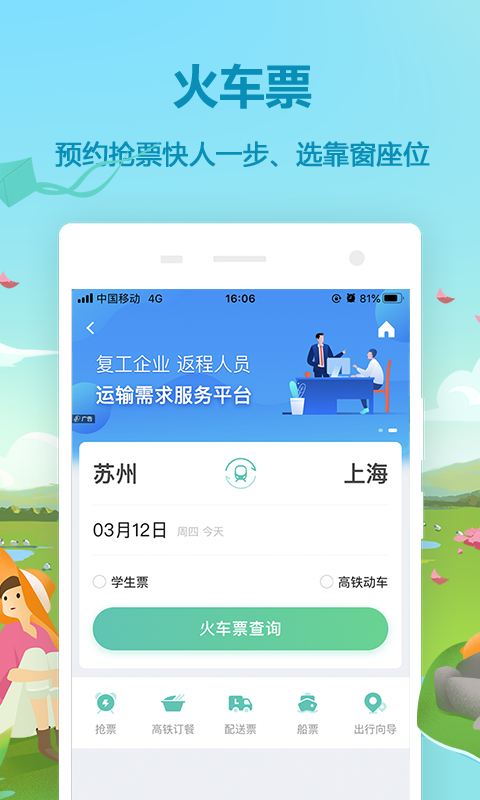 火车:支持在线退票和微信支付等多种支付方式。全国列车时刻、余票实时查询,还可查询中转汽车Ʊ信息;还有接火车服务!再也不用排队等待!