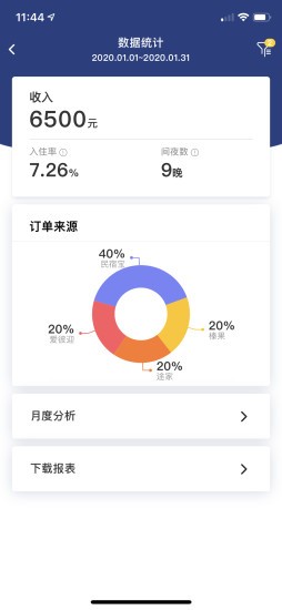 民宿宝APP聚合多渠道运营和财务数据,按照日期统计经营收入、入住率、间夜数、订单来源和平均房价等多项指标,并自动生成可视化经营数据图表。