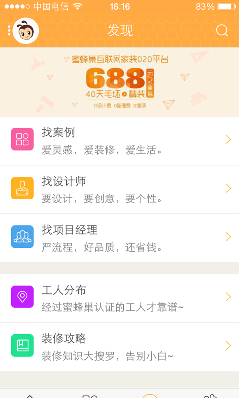 1、蜜蜂巢装修是行业领先的互联网家装平台。公司推出的688元/㎡标准化家装套餐;