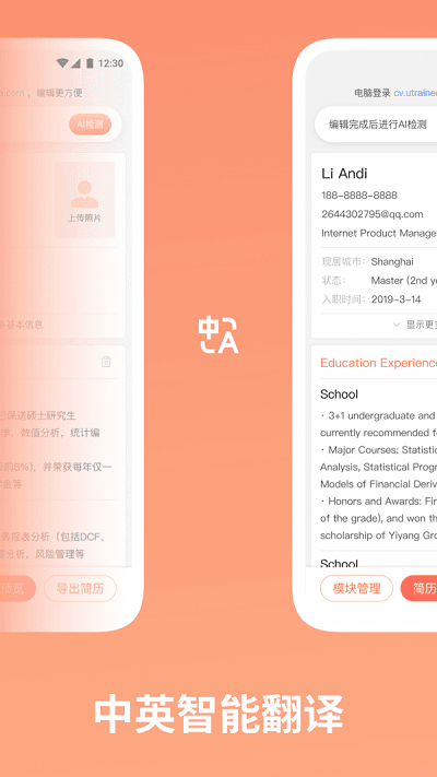 2、一键排版,支持自动一页、自动倒叙、一键切换简历模板、标题风格;