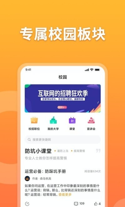 【校园板块】在这里,有更多的专属的校招职位!认准自己的学校,通过与校园合作的企业求职,更加高效,准确,信息更加精准,真实!