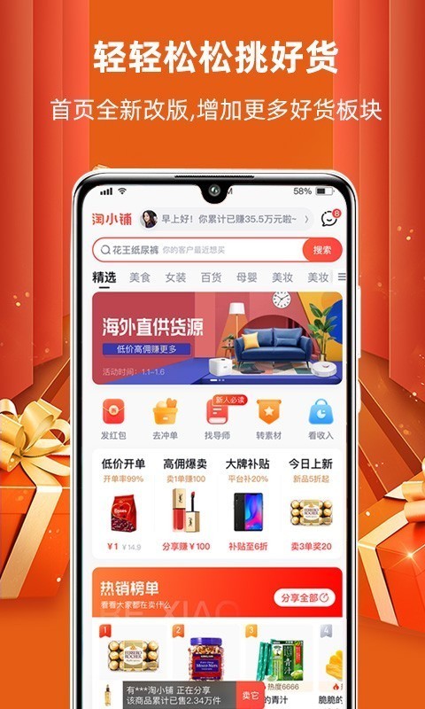 淘小铺app有各种海量购物商品能随时购买哦,本款软件一键分享就能赚钱非常好用,并且还有精选好货能随时查看使用哦,还有上千匹配能随时查看,主打分享赚钱的电商购物平台,拥有来自全球各地区的商品渠道,淘小铺app商品都是正品大家可以放心。分享淘小铺app上的商品再购物就能获得丰厚奖励!淘小铺是一款轻松创业赚钱的应用,入驻成为小铺掌柜即可开启赚钱之旅。只需动动手指分享宝贝给朋友,在对方完成购买后即可获得相应比例的佣金奖励,无需承担发货和售后,从而实现真正的“一键开店创业”。