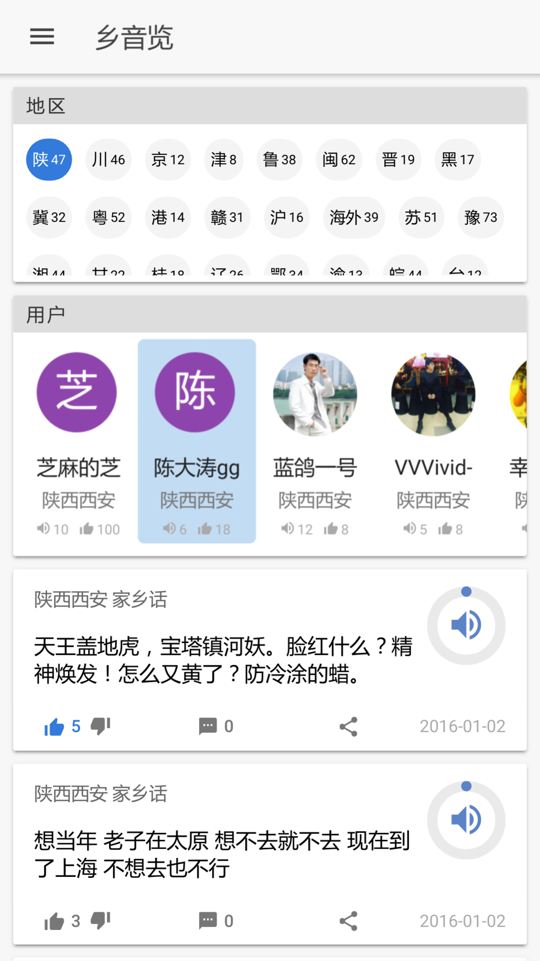 1.支持一键录制家乡话,设置家乡地区,将家乡话上传到这里;