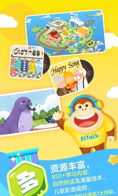 多:资源丰富,850+学习内容、自然拼读及海量绘本、儿歌影音视频,涵盖听说读写玩演唱7大技能。