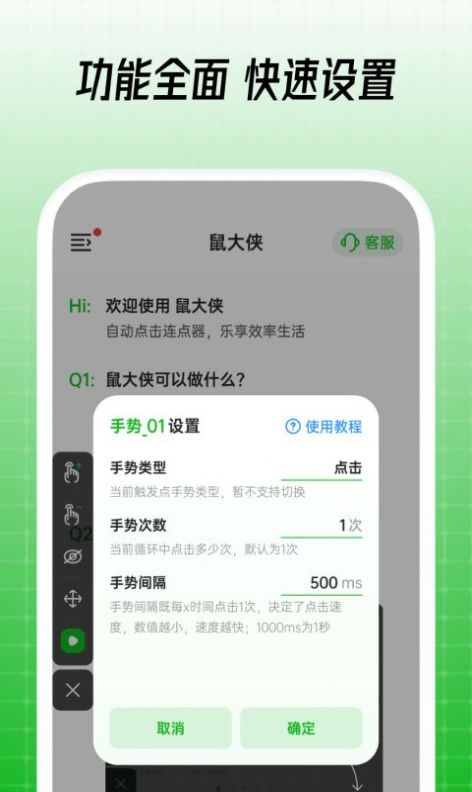 鼠大侠鼠标连点器是一款手机版的屏幕点击工具,在这里用户不需要一直去点击屏幕。可以帮助用户解放双手。用户可以根据点击屏幕的时间设置出来,如点击的时间,点击的频率,方便用户省心又能省力,每秒可实现100次自动点击操作只需要设置你所需要的鼠标单击方式、点击间隔和功能热键,程序即可完成自动点击操作,再也无需手动繁琐的进行点击了。