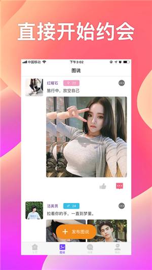 1、在线交友,害怕被拒绝吗?这里可以直接发布约会,没有拒绝,相互同意之后才是约会的开始,所以呀,你可以把你的约会发的浪漫一些~!