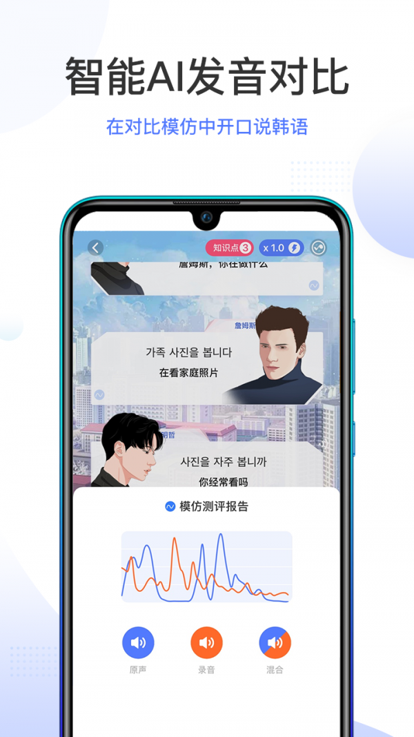 2.情景对话小剧本:小剧本跟读,开口说韩语,还有AI模仿测评助力发音。
