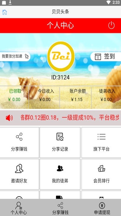2、天天领签到红包(0.1-50元),当天收益大于20元(包含转发收益+收徒奖励,不包含徒弟收益)。