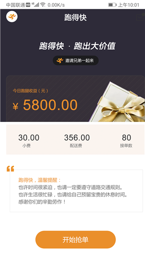 跑得真快是一款专门为骑手打造的手机接单配送服务应用软件。跑得真快app上,用户注册之后就能够成为平台的专业骑手,一键匹配就能开始接单,平台目前的接单收入还是很不错的一天就能赚到不少。平台还为用户准备了专业的导航功能,为你规划最近的路线,帮助你能够快速送达。
