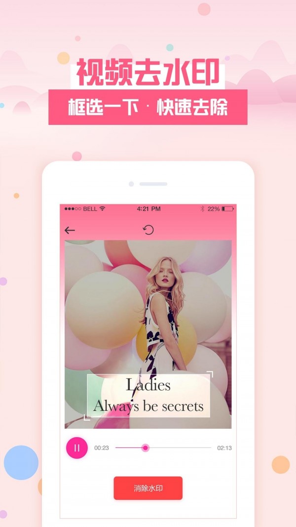 去水印秀app是一款界面清爽,功能丰富的p图软件,各种花式去水印总有一款适合你,具有裁剪法、覆盖涂鸦等去除方法,可以去掉水印也可以添加水印,支持剪辑配音等其他功能,傻瓜式的去水印方法让广大用户彻底告别繁琐的教程,快速处理图片,添加工具,软件内有非常多的功能,让你能够轻松的使用,有需要者欢迎免费下载!