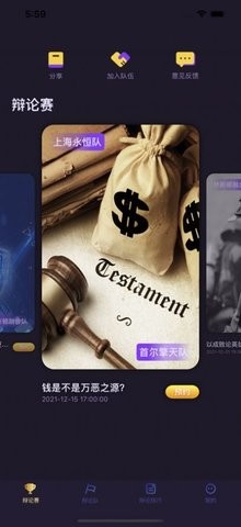 1、精彩辩论:这里有精彩的赛事信息,选择感兴趣的辩论赛等待开场。