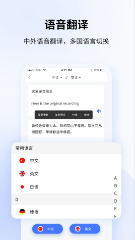 1.帮助用户实时翻译英文,法语等,除此之外还能快速,精准的将音频翻译为文字或将文字转换为音频,还有多种声线选择,非常方便,全能录音转文字App,一款集翻译