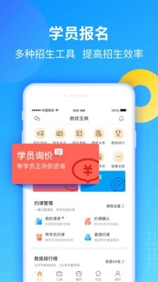 1、教练宝典是由木仓科技出品的一款为驾校及教练量身打造的集招生、教学、管理为一体的全新产品。