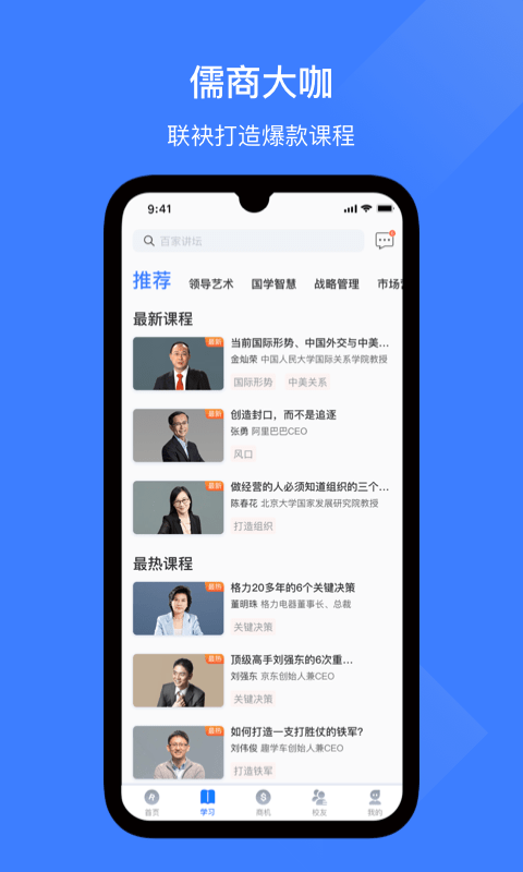邀请1000+行业大咖 、专家名师,打造顶尖的商学院,老板悄悄话,总裁读书会,大师论道,儒商故事等系列企业经营管理精品课程。