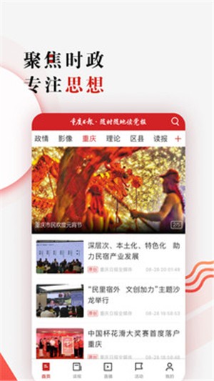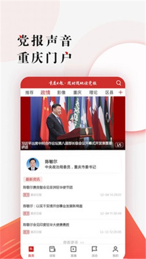 重庆日报是一款重庆本地的日报软件,这里可以让你足不出户就能直销天下事,政务要闻都是可以在线获取的,增长自己的见识都是需要在线查看,及时的跟踪哦,喜欢看日报的都可以在线看看,比看报纸方便多了,随时都可以观看,最主要是不需要花钱买报纸啦,快来这里看看最新的新闻动态吧!