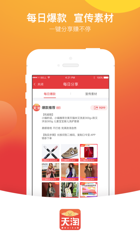 天淘麦坝app是一款淘宝达人都在用的购物app,天淘麦坝app商品种类齐全,质量好,而且天淘麦坝app实时更新商品,让用户找到最喜爱的商品。