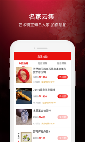 鑫艺拍拍app是一款可以随时利用手机就可以拍卖的软件,在这里你可以拍卖你闲置的物件,同时还可以随时拍下感兴趣的商品,商品种类也非常多,不仅包括各种普通商品,还有不少知名画家的作品,随时开启各种拍卖之旅,喜欢的欢迎下载使用。