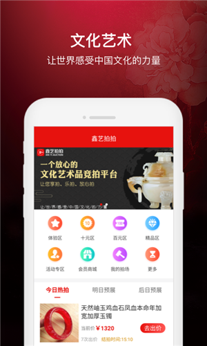 鑫艺拍拍是一款拍卖购物平台,打造拍卖购物新场景,每一次出价,都能获得拍卖红包,打破传统拍卖公司独家收取拍卖佣金模式,将拍卖佣金分享给所有拍卖购物参与者。