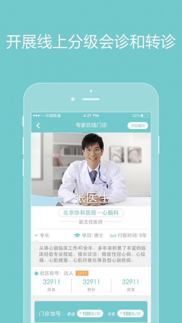 通过搭建三层分级诊疗平台,帮助患者向基层医生、医生、和专家发起问诊、会诊、和转诊。