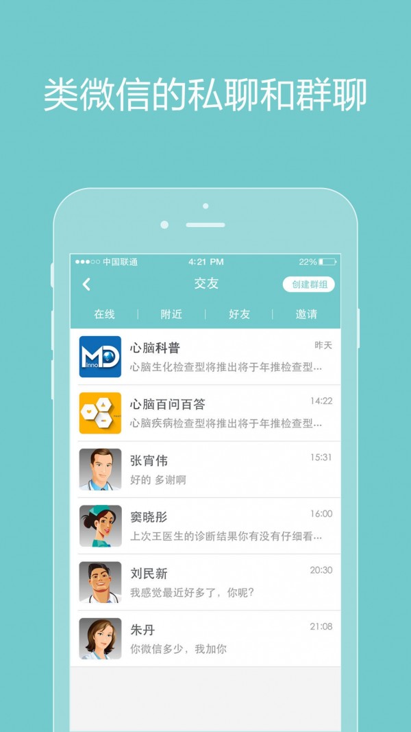 3.类微信交友功能,与医生和患者建立好友关系,私聊和群聊