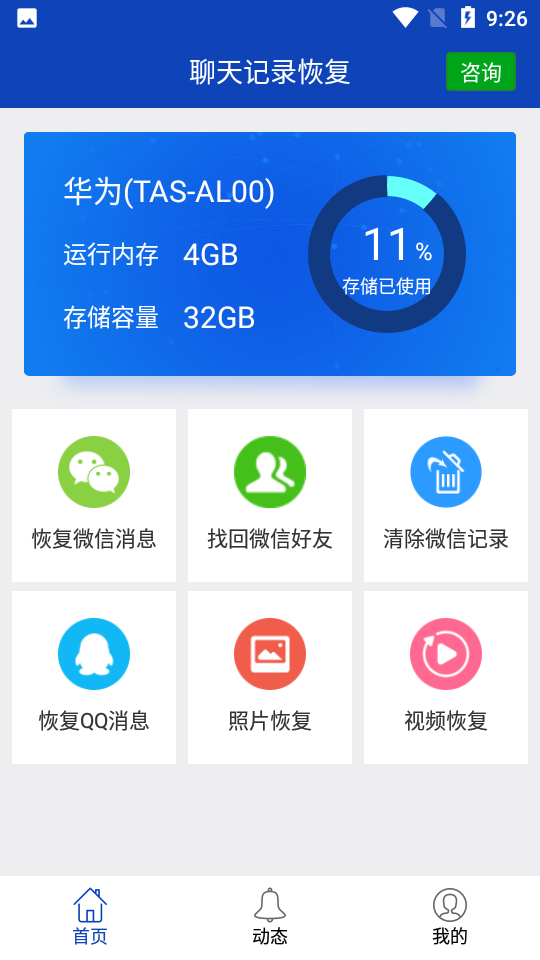 聊天记录恢复app是一款功能非常强大的数据恢复神器,在聊天记录恢复app上你可以一键恢复微信,qq,相册的数据,不仅可以复制文字,语音和图片也都可以恢复,非常简单实用的一款app.
