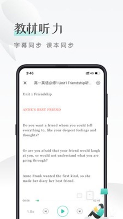【教材听力】 精选初中到高中的课本英语听力,每章节均带有字幕,同步课本练习,反复听。