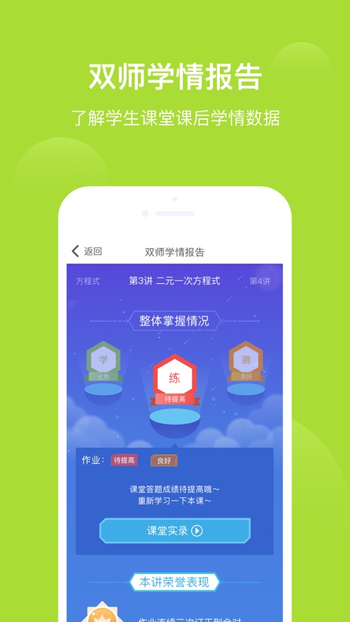 “爱学习”APP目前支持多学科的课后练习, 英语特有口语练习,还为双师班级提供了可以在课后查看课堂回放、课堂报告的功能。