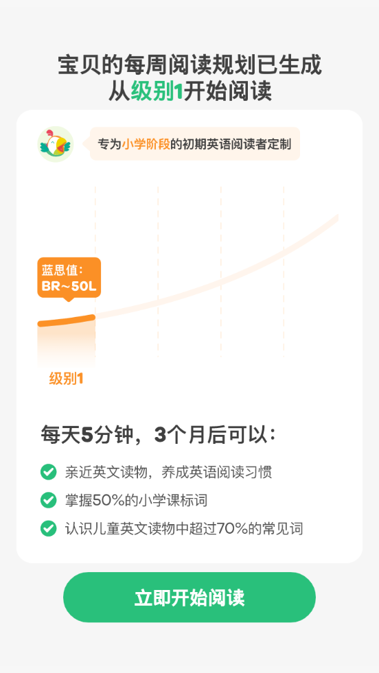 科学定位初始阅读水平,每周智能推送阅读规划,全程跟踪阅读表现。并根据艾宾浩斯遗忘曲线,匹配适合孩子阅读水平的内容,科学调节读物难度,由易到难,逐级进阶。