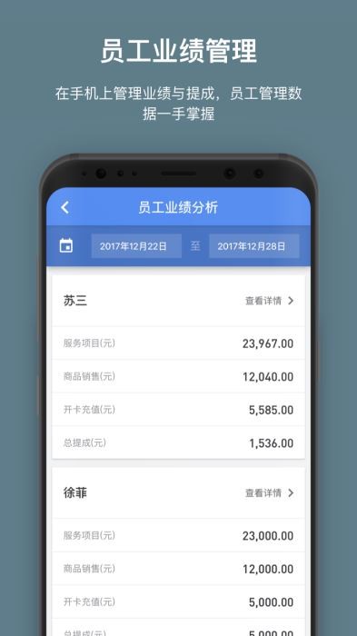 2、详细图表,每日生成营业额、员工业绩等数据图表