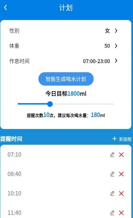 2.系统能自动生成喝水计划,喝水时间和喝水量直接知道,养成好的喝水习惯。