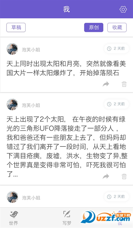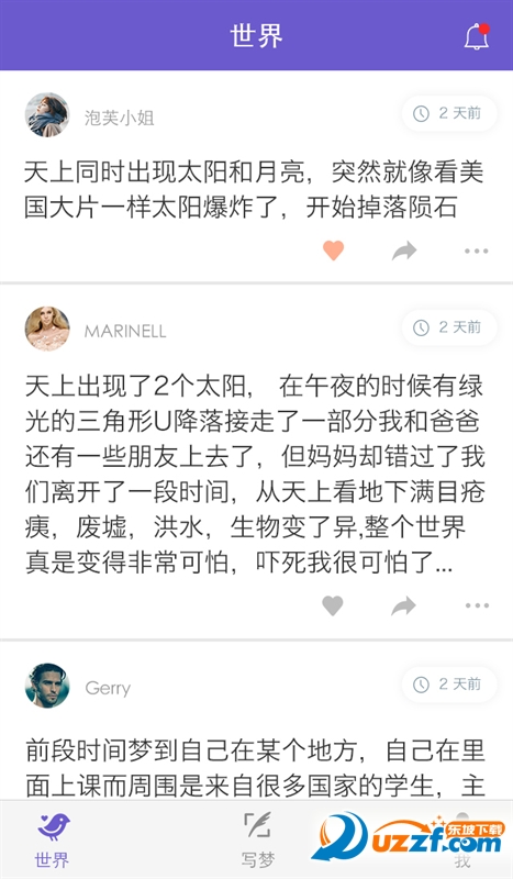 1、世界分享,通过平台在世界当中分享自己的梦,把每天的梦传播给大家。