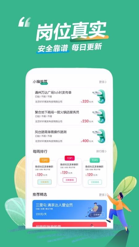 2、兼职的信息经过了全面的审核,保证你找到的工作真实、可信,完工当天就能结算。