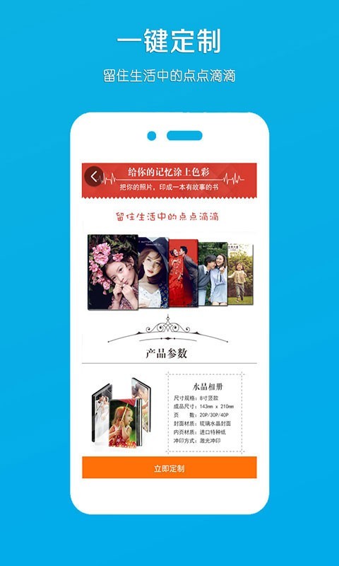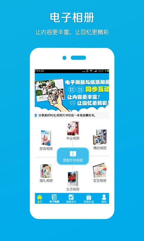 电子相册app专注于相册书及个性礼品,把旅游,毕业、生活等照片印成相册书,这款电子相册制作软件是情书、是旅途日记、是心情写照、是宝宝成长记录……只要有照片的地方就有故事,这是让你长时间保存这故事的应用,同时可以冲印成一本实实在在的纸质书,线上线下同步保存这份有故事的记忆,儿女情长都在电子相册app这里,有你的回忆点滴串起你人生的足迹与意义。