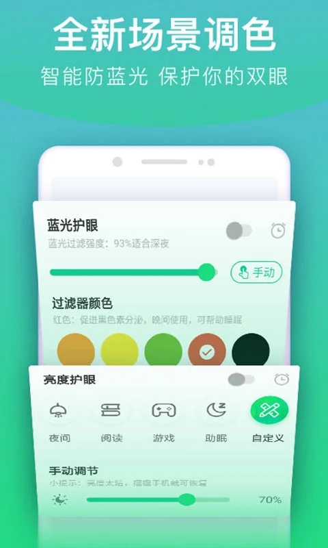 滤光调节:不同情境下,过滤不同光线。读书更轻松,护眼更专业,手机必备护眼宝