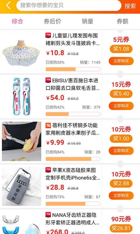 1.商品智能筛选,用户可以根据综合或是券后价以及销量、券额为条件筛选商品;